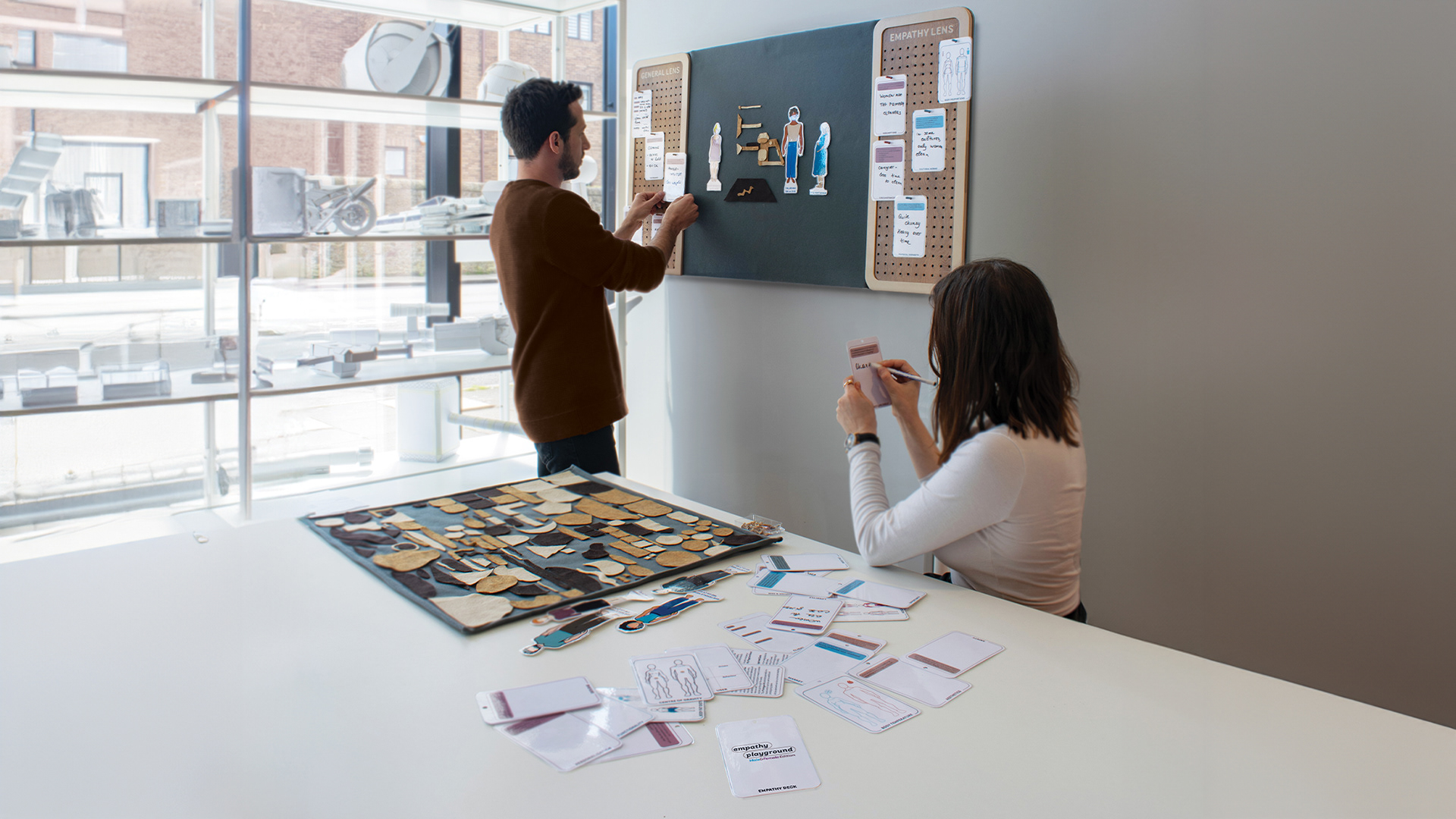 The bespoke Empathy Playground Board is a creative space with a Prototype Kit for visualizing concepts. Made of bamboo pegboards, it includes a cork-backed nylon prototype area, synthetic felt shapes, and seven-scale figures representing men and women.